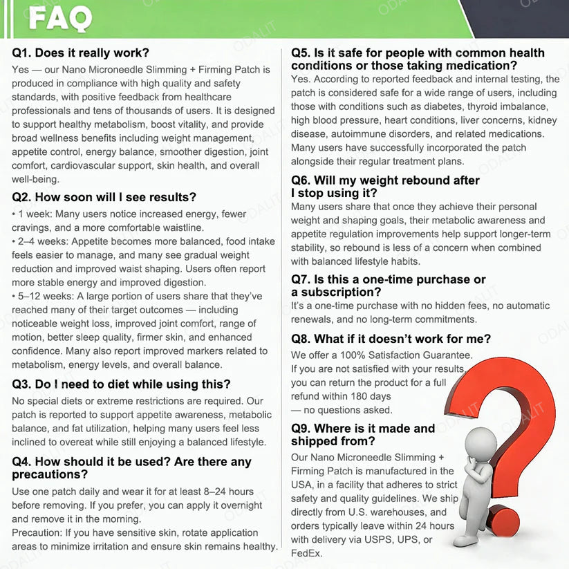 'We are a team of endocrinology experts, most of whom have personally experienced obesity and its related complications. This is why we are dedicated to developing safe, natural, and effective solutions to improve metabolic health and support weight management. Over the course of 12 years of research, our team members first trialed the solution themselves, achieving significant weight reduction without rebound or side effects. We then conducted extensive studies and clinical trials involving more than 5,000 participants, which further confirmed that ODALITยฎ Caffeine ยท L-Carnitine ร Retinol | Slimming & Firming 2-in-1 Nano Microneedle Patchย delivers remarkable and lasting benefits in metabolic regulation, appetite control, and overall health improvement for individuals over 40 struggling with obesity. Supported by modern medical research, ODALITยฎ ๐พ๐๐๐๐๐๐ฃ๐ ยท ๐-๐พ๐๐ง๐ฃ๐๐ฉ๐๐ฃ๐ ร ๐๐๐ฉ๐๐ฃ๐ค๐ก | ๐๐ก๐๐ข๐ข๐๐ฃ๐ & ๐๐๐ง๐ข๐๐ฃ๐ ๐ฎ-๐๐ฃ-๐ญ ๐๐๐ฃ๐ค ๐๐๐๐ง๐ค๐ฃ๐๐๐๐ก๐ ๐๐๐ฉ๐๐ has passed the FDAโs rigorous regulatory review and certification, with its effectiveness and compliance officially validated. It stands as a trustworthy, science-driven choice, especially for those seeking a natural, safe, and effective approach to weight management and comprehensive health support. Whether youโve been struggling with weight for years or just want to protect your health as you age, this is a safe, science-backed solution you can trust.